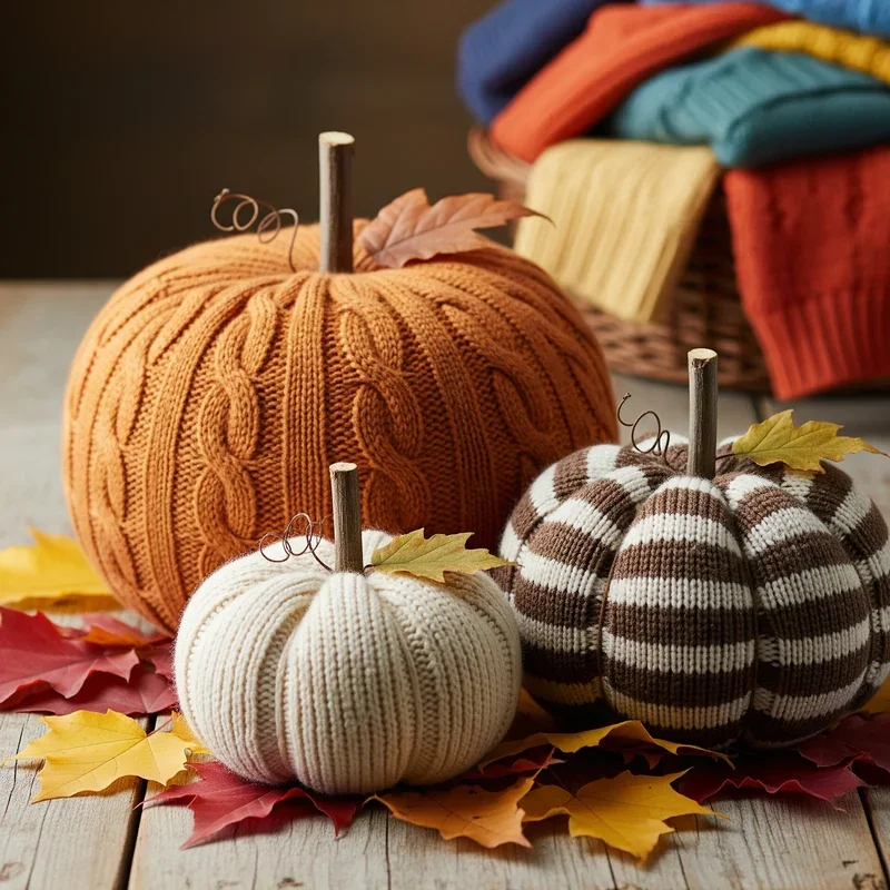 Give worn sweaters new life as adorable fabric pumpkins that add cozy texture to fall displays. Cut sweater sleeves into tubes about 6-8 inches long, turning one end inside out and securing with rubber band or stitching. Turn right-side out and fill with batting, rice, or plastic bags for different weights and textures. Gather the top and secure tightly, leaving excess fabric as a decorative tuft or trimming close for cleaner look. Use twine or yarn to create pumpkin segments by wrapping from bottom to top, pulling slightly tight to create indentations. Add real stems from craft stores or create stems from cinnamon sticks or twisted branches. Embellish with burlap leaves, raffia bows, or buttons for extra charm. Create groupings using different sweater patterns and sizes, mixing cable knits, fair isle patterns, and solid colors. These no-sew alternatives work perfectly for crafters intimidated by sewing machines while delivering professional-looking results that add warmth to any space.