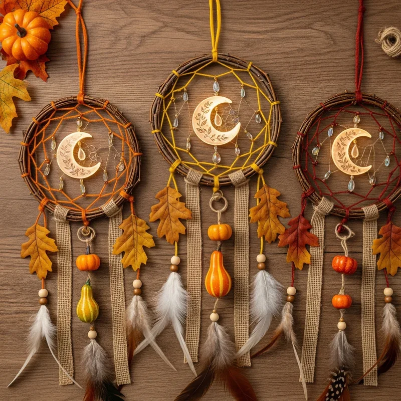 Reimagine traditional dream catchers with autumn elements for unique wall hangings that capture the season's mystical beauty. Wrap embroidery hoops or bent twigs circles with burlap ribbon or autumn-colored yarn, securing with hot glue. Weave centers using traditional dream catcher patterns with twine or yarn, keeping tension consistent for symmetrical designs. Alternatively, create simpler versions by crisscrossing ribbons or arranging preserved leaves in web patterns. Attach natural elements like small pinecones, acorns, or dried flowers throughout the weaving using thin wire or glue. Create hanging elements by attaching feathers, cinnamon sticks, or dried orange slices to ribbons or leather cords at varying lengths. Add wooden beads or small bells for gentle sounds when breezes pass through. These modern interpretations work beautifully in bedrooms, covered porches, or meditation spaces. Each piece becomes uniquely yours through personal element choices, creating meaningful decor that protects peaceful autumn dreams while celebrating the season's natural abundance.