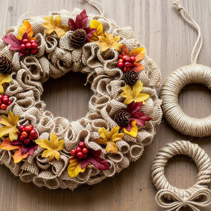 Channel farmhouse chic with these textured wreaths that scream autumn without relying on typical orange and black color schemes. Start with a foam or straw wreath form, wrapping it entirely with burlap ribbon, overlapping edges to hide the form completely. Secure burlap with hot glue at strategic points, keeping the fabric slightly loose for natural texture. Create burlap flowers by cutting circles, pulling threads to create frayed edges, and layering different sizes with button centers. Add dimension with twine-wrapped wooden letters spelling "FALL" or "GRATEFUL," attaching them asymmetrically for visual interest. Incorporate natural elements like mini cotton stems, dried wheat stalks, or preserved eucalyptus for organic appeal. Consider adding battery-operated micro lights woven through the burlap for evening glow. These wreaths work beautifully indoors or on covered porches, and their neutral palette transitions seamlessly from September through November. The materials cost less than $15, yet the finished product rivals expensive boutique versions.