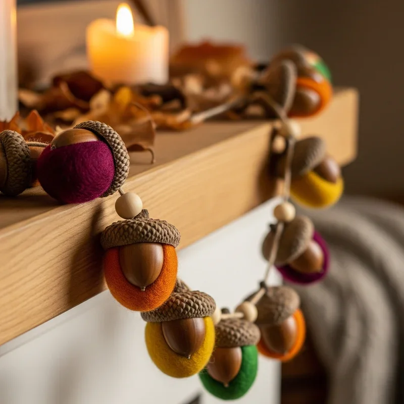 Who knew wool roving and real acorn caps could create such whimsical autumn decor? This project combines natural elements with colorful felt balls for a playful yet sophisticated garland perfect for mantels or doorways. Collect acorn caps during nature walks, selecting intact ones without cracks, and clean them thoroughly with soapy water. Purchase wool roving in autumn colors like burnt orange, golden yellow, deep red, and forest green, then wet-felt small balls by rolling the wool with soap and warm water until firm. Alternatively, buy pre-made felt balls if you're short on time. Attach caps to felt balls using strong craft glue, holding firmly until set. String your felted acorns onto twine or fishing line, spacing them evenly and mixing colors for visual interest. Add real mini pinecones or wooden beads between acorns for variety. This charming garland brings woodland magic indoors and makes thoughtful handmade gifts for autumn-loving friends.