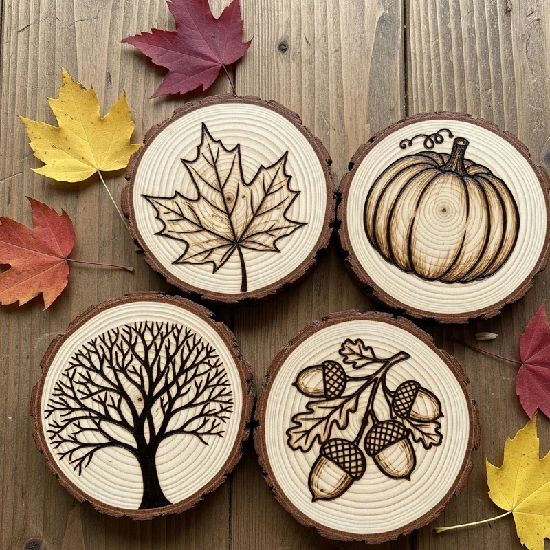Bring rustic elegance to coffee tables with these personalized coasters that showcase both nature's beauty and your artistic skills. Source wood slices from craft stores or cut your own from fallen branches, ensuring they're about 3-4 inches diameter and half-inch thick. Sand surfaces smooth, progressing from coarse to fine grit for professional finish. Using a wood-burning tool, create designs ranging from simple autumn leaves to intricate mandalas or meaningful quotes. Practice on scrap wood first, as pyrography requires steady hands and patience. Trace designs with pencil before burning for precision, varying pressure and tip styles for different effects. Once designs are complete, apply food-safe sealant for water resistance and durability. Add felt pads underneath to protect furniture surfaces. Create seasonal sets featuring different autumn motifs, or personalize with family initials for unique gifts. These coasters improve with age, developing patina that adds character while protecting furniture from drink rings and heat damage.