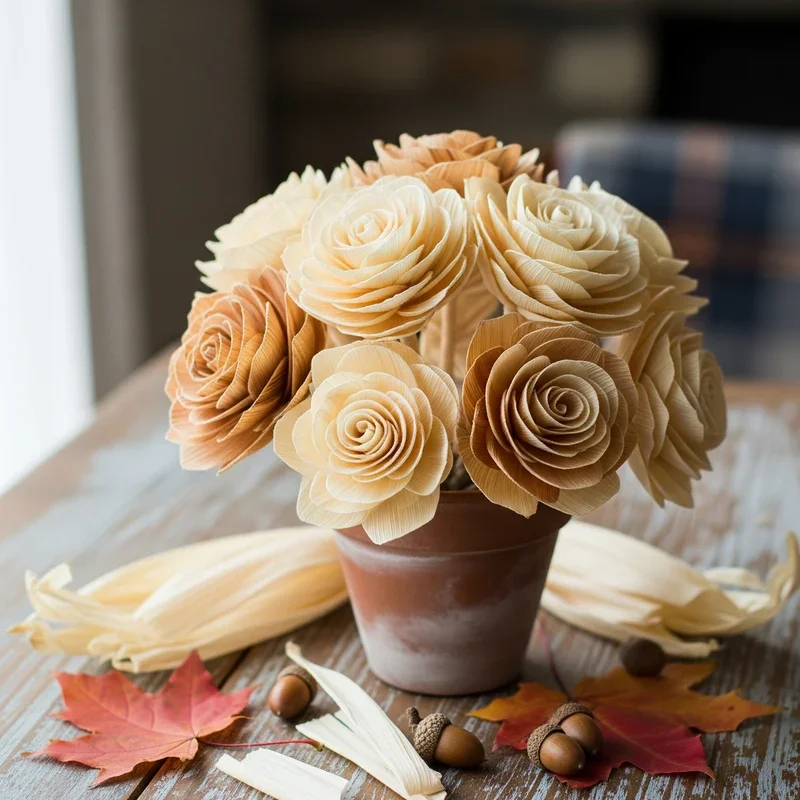Discover the surprising versatility of corn husks in creating delicate flowers that rival silk alternatives. Soak dried corn husks in warm water until pliable, about 20 minutes, then pat dry with towels. Cut husks into petal shapes, using scissors to create pointed or rounded ends depending on flower type desired. Layer petals around floral wire stems, securing with floral tape and building flowers from center outward. Create roses by rolling strips and adding outer petals, or fashion sunflowers with multiple petal layers. Dye husks with food coloring or fabric dye before assembling for colorful blooms, or leave natural for elegant neutral arrangements. Add texture with twisted husk leaves and combine different flower styles for dynamic bouquets. These lightweight flowers work beautifully in wreaths, centerpieces, or standalone arrangements. Unlike fresh flowers, these creations last indefinitely and cost pennies to make, providing sustainable alternatives to plastic flowers while maintaining organic beauty.