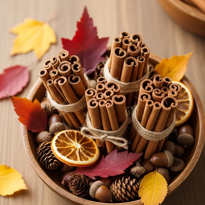 Fill your home with autumn's signature scent while creating rustic decorations that appeal to multiple senses. Gather cinnamon sticks in varying lengths, bundling them with hot glue to create different shapes like stars, trees, or simple clusters. Wrap bundles with plaid ribbon, burlap, or twine, securing with hot glue and adding small embellishments like star anise, dried orange slices, or tiny pinecones. Create cinnamon stick candle holders by gluing sticks vertically around glass votives, or fashion napkin rings for Thanksgiving dinner. Hang smaller bundles from cabinet knobs or door handles to spread fragrance throughout your home. For gift toppers, attach cinnamon bundle ornaments to wrapped presents, adding both decoration and aromatherapy. These versatile decorations work anywhere from bathroom potpourri to kitchen displays. The natural antibacterial properties of cinnamon make these crafts both beautiful and functional, while their warm scent triggers cozy autumn memories every time you pass by.