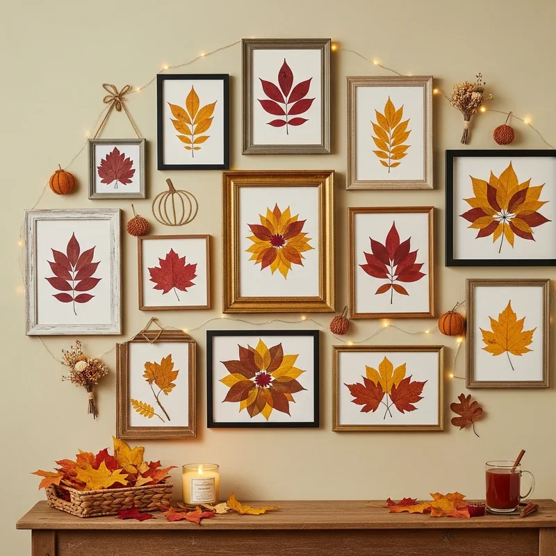 Transform your collected autumn leaves into sophisticated wall art that captures fall's fleeting beauty forever. Start by gathering leaves in various shapes, sizes, and colors during peak foliage season, selecting specimens without tears or brown spots. Press them between newspaper pages inside heavy books for two weeks, changing the paper after the first few days to prevent molding. Once dried, arrange your pressed leaves between glass frames, floating them against white or cream backgrounds for a minimalist look, or layer them over vintage book pages for rustic charm. Create themed collections like maple leaves in gradient colors from green to deep red, or mix different species for botanical diversity. Consider adding handwritten labels with collection dates and locations for a scientific herbarium feel. Group multiple frames in odd numbers for visual impact, varying frame sizes and orientations to create dynamic wall displays. This project costs practically nothing yet delivers gallery-worthy results that celebrate nature's artistry.