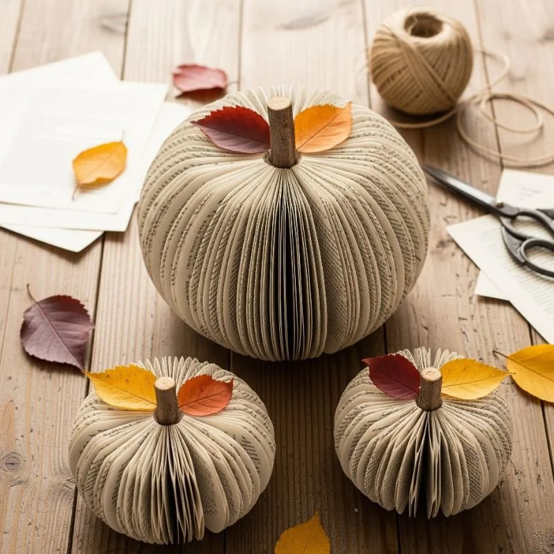 Give old books new life as three-dimensional pumpkins that bibliophiles will adore! Fold book pages accordion-style, fan into circular shape, and secure to create rounded pumpkin forms. The aged paper creates instant vintage appeal while text patterns add unexpected visual interest. Top with real stems or create from twisted paper and twine. These literary pumpkins work perfectly for subtle fall decor that doesn't scream "Halloween!" Stack various sizes for impact or integrate into existing book displays. The folding process becomes meditative while transforming forgotten books into conversation pieces. Choose books thoughtfully: old phone books for neutral decor, vintage novels for romantic touch, or colorful children's books for whimsy.