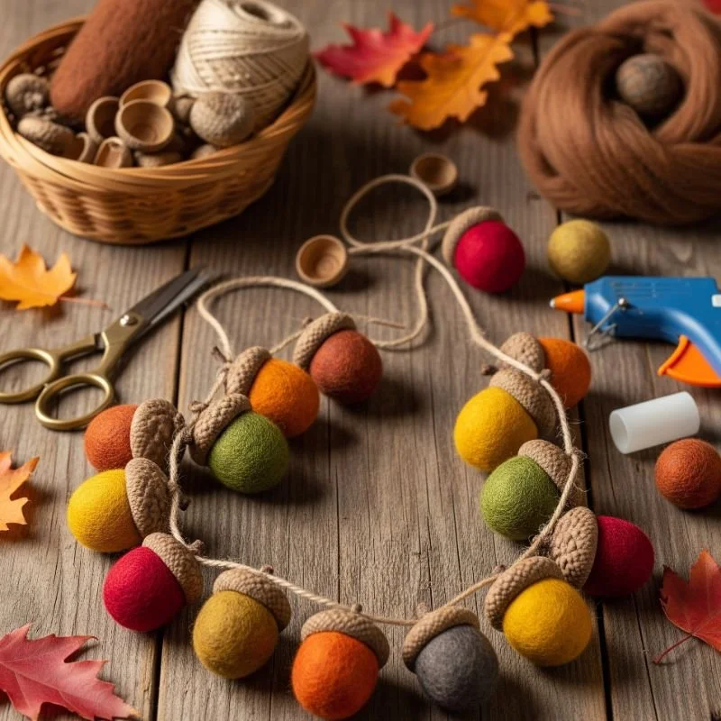 Channel woodland fairy vibes by creating whimsical garlands using real acorn caps and colorful wool felt balls! This unexpectedly elegant craft combines natural elements with soft textures for pure autumn magic. Collect acorn caps during nature walks (check for hitchhiking bugs first!), then hot glue small felt balls inside to create oversized acorns. Thread them onto twine with wooden beads between for spacing. The result? A garland that looks like it fell from an enchanted forest. Drape across mantels, wind around banisters, or frame doorways for instant fall atmosphere. Choose traditional browns and oranges or go bold with jewel tones for modern twist. This project teaches patience but rewards with compliments from every guest who spots your handiwork.