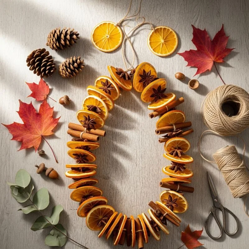 Fill your home with citrus-cinnamon scent while creating garlands that look like sunshine captured in circles! Slice oranges thinly, bake at low temperature until dried, then string with cinnamon sticks and bay leaves. The translucent orange wheels glow beautifully when backlit, creating warm ambiance. This old-fashioned craft connects us to simpler times when decorations came from kitchens, not stores. The drying process perfumes your home better than any candle while anticipation builds for the finished product. Hang across windows, wrap around trees, or layer in bowls for fragrant potpourri. These natural decorations decompose completely, making them eco-friendly alternatives to plastic decor. Plus, the meditation of slicing and stringing provides stress relief during busy fall seasons.