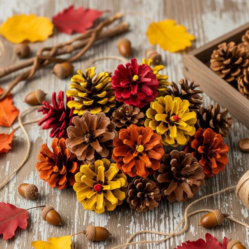 Turn nature's free art supplies into stunning floral arrangements that never need watering! Collect pine cones of various sizes, then paint the tips to resemble flower petals. Think zinnias in burnt orange, mums in deep burgundy, or even modern metallics for contemporary spaces. Once dry, hot glue them to wooden dowels or branches for stems. Arrange in vases filled with coffee beans or acorns for extra fall flair. These everlasting blooms solve the problem of expensive fresh flowers while adding textural interest to any room. The painting process proves surprisingly relaxing, like adult coloring books but with dimension. Make extras for gift-giving; everyone appreciates flowers that won't die in a week.