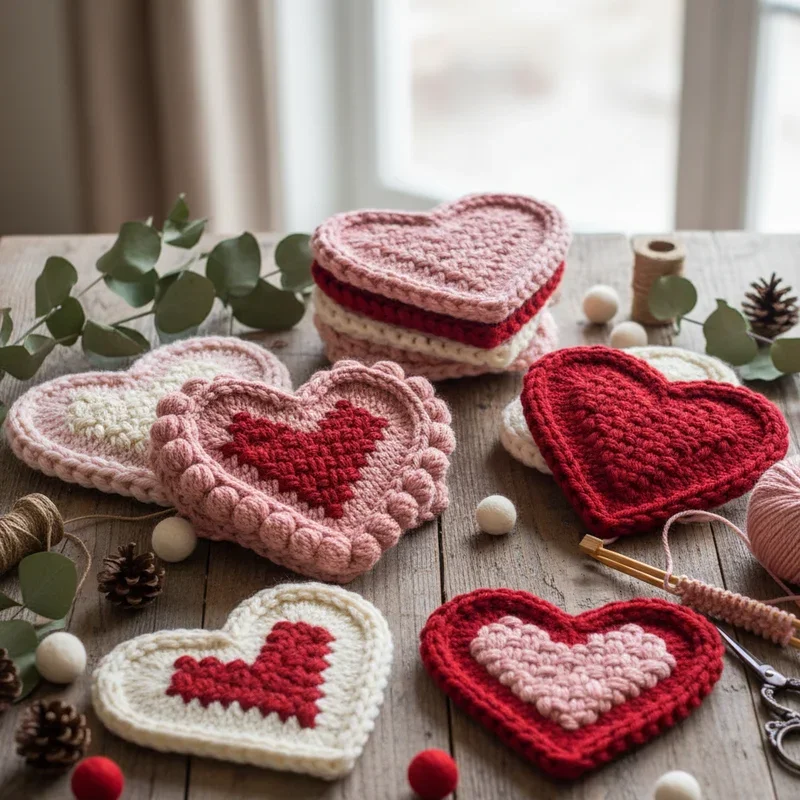 Click needles together creating cozy heart-shaped coasters that protect furniture while adding handmade charm to February entertaining! Use cotton yarn for absorbent, washable coasters that handle coffee mug condensation and hot chocolate spills. Simple knit and purl stitches form heart shapes that even beginning knitters can master with practice. These practical projects provide portable crafting that fills waiting room time or evening TV watching productively. Create sets in coordinating colors for gifts that show effort and care beyond store-bought alternatives. The textured surface adds tactile interest to smooth table surfaces while protecting wood from water rings and heat damage. Layer different sized hearts for dimensional displays when coasters aren't actively protecting furniture.