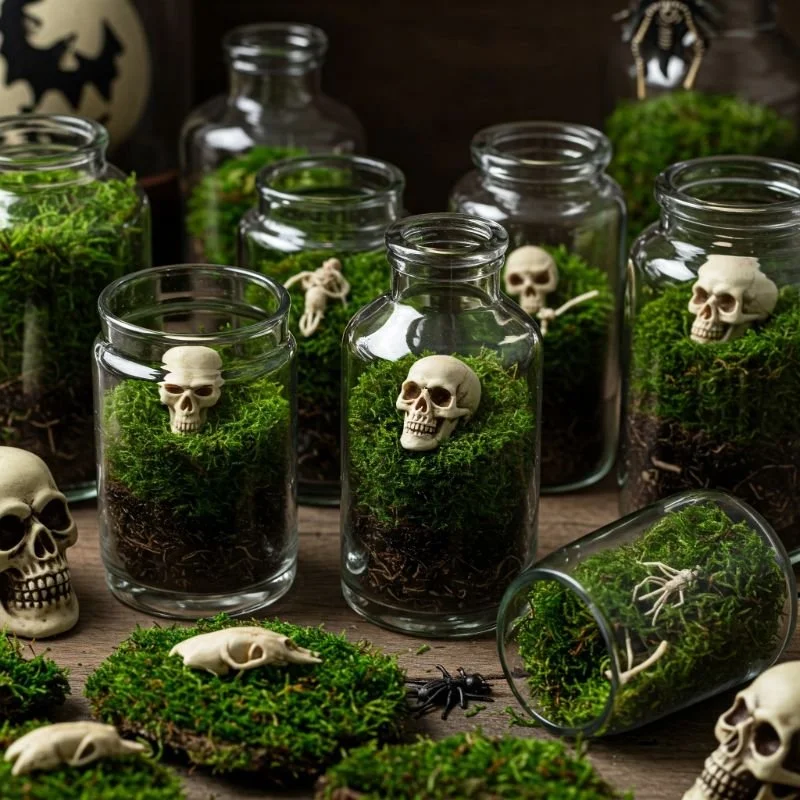 Craft miniature worlds of beautiful decay using glass containers, preserved moss, and small animal skull replicas. These memento mori terrariums balance natural elements with subtle macabre touches. Begin with a glass vessel—apothecary jars, bell cloches, or even fishbowls work beautifully. Create a foundation of preserved moss (available at craft stores) in various shades of green to establish an otherworldly forest floor. The haunting focal point emerges as you position small resin animal skulls, miniature tombstones, or tiny skeleton parts among the verdant growth. Isn't there something fascinating about the juxtaposition of death symbols against lush greenery? I particularly love adding minute details like tiny mushrooms, black roses, or a miniature raven perched atop a branch. These living dioramas require no watering and maintain their eerie beauty year-round.