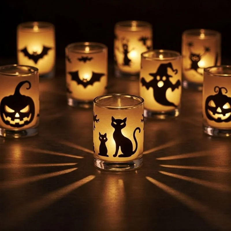 Create mesmerizing light displays that cast sinister shadows across your walls with these deceptively simple candle holders. Start with plain glass hurricanes or cylindrical vases—the taller, the better for dramatic shadow play. Cut eerie silhouettes (think spindly trees, Victorian mansions, or circling bats) from black cardstock using either a craft knife or cutting machine. The magic happens when you adhere these designs to the exterior of your glass containers and place LED candles inside. Have you ever noticed how something as simple as a shadow can evoke such primal fear? That's exactly what makes these pieces so effective. I love arranging several together along a mantel or down a dining table, where the overlapping shadows create a miniature haunted landscape that dances with every flicker.