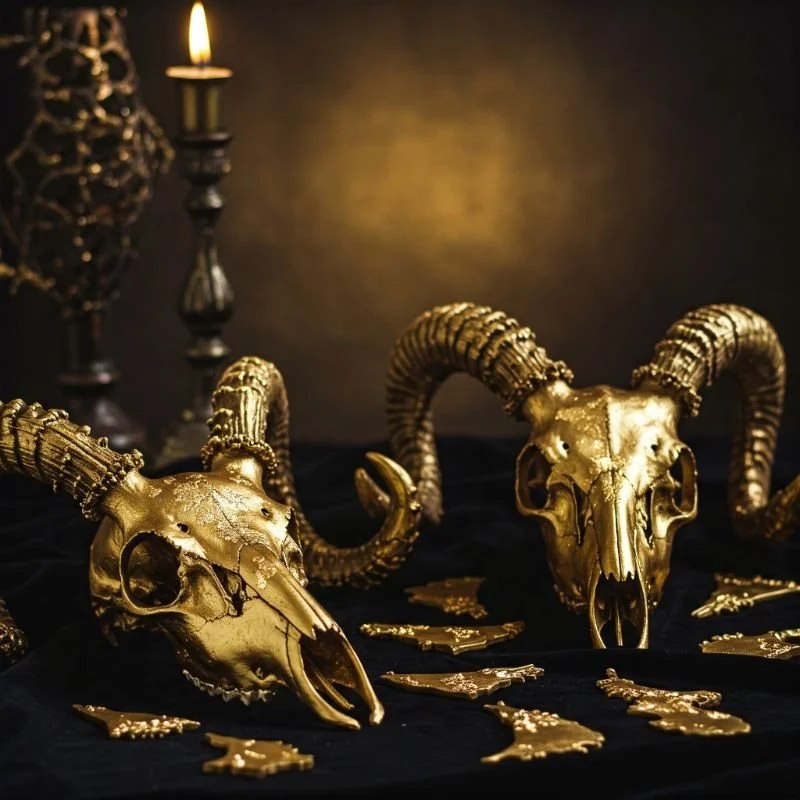 Transform the macabre into the magnificent with gold-leafed animal skull replicas that serve as sophisticated memento mori. Begin with realistic resin skull reproductions—ethical alternatives to real bones that provide identical aesthetic impact. The alchemy happens when you apply metal leaf to selected areas, creating a striking contrast between the bone's natural ivory and gleaming metallic surfaces. Isn't it fascinating how a touch of gold instantly elevates something from grotesque to glamorous? I recommend focusing your gilding on specific features—teeth, eye sockets, or intricate patterns across the cranium—rather than covering the entire surface. Mount your finished pieces on stained wood plaques or bell jar displays for museum-quality presentation. These striking conversation pieces work year-round in bohemian or gothic-inspired interiors, proving that Halloween aesthetics can transcend seasonal decoration when executed with artistic sophistication.