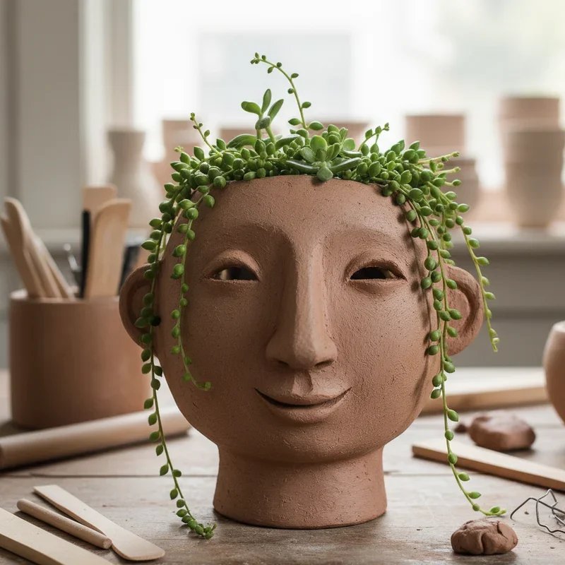Face planters inject humor and humanity into functional pottery, transforming simple containers into conversation-starting art pieces. Hand-build these characterful planters using slab or coil techniques, sculpting expressive features that give each piece unique personality. Exaggerate features for dramatic effect or keep expressions subtle and serene depending on your aesthetic preferences. The plant's foliage becomes hair sprouting from the head, creating living sculptures that evolve as plants grow. These planters work beautifully for succulents, herbs, or trailing plants that cascade like beards or wild hair. Experiment with different expressions from peaceful to quirky, creating an entire family of face planters. Glazing choices dramatically affect personality; soft pastels feel dreamy while bold colors pack punch. Your plants gain companions that make tending them even more enjoyable and engaging.