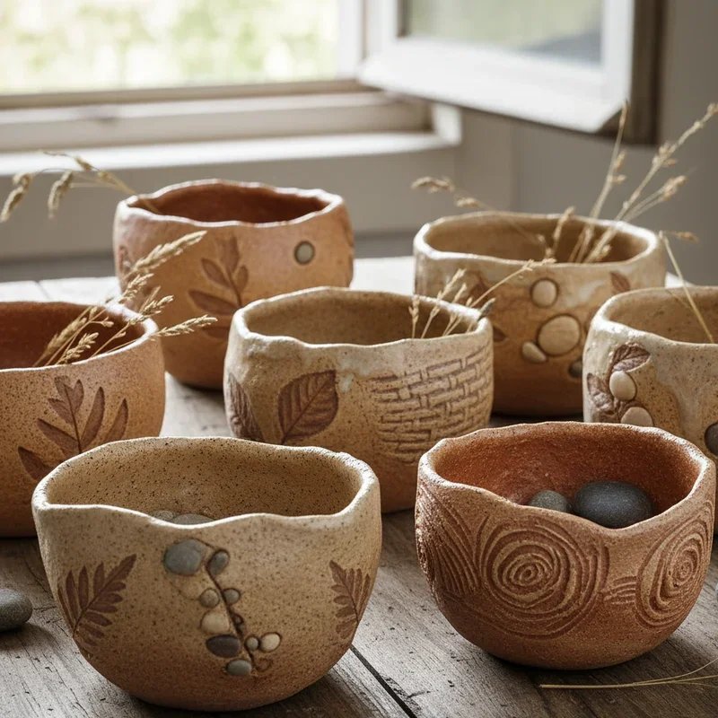 Pinch pots represent pottery in its purest form, requiring nothing but clay, your hands, and creativity. Start with a ball of clay, press your thumb into the center, then pinch and rotate to create walls of even thickness. The magic happens when you add texture using natural objects like leaves, lace, shells, or tree bark pressed into the soft clay surface. These impressions create stunning organic patterns that connect your pottery to nature itself. Perfect for beginners, pinch pots teach fundamental techniques while producing beautiful results immediately. Use them as small planters, jewelry holders, or decorative bowls that showcase nature's own designs. The imperfections become features rather than flaws, celebrating the handmade quality. Experiment with different clay bodies and glazes to enhance the textured surfaces you've created.