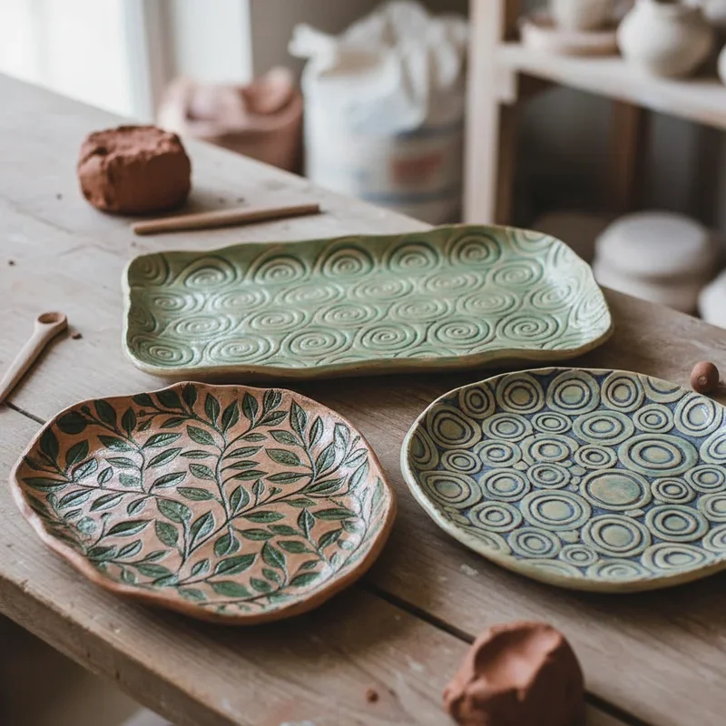 Large serving platters showcase your design skills across generous surfaces perfect for bold patterns and decorative techniques. Roll out clay slabs to consistent thickness, then cut into desired shapes from organic ovals to geometric rectangles. Create patterns using stamps, sgraffito techniques, or inlaid colored clay before the piece dries. Slightly curve edges upward to contain foods while keeping the center flat for stability. These platters become centerpiece-worthy serving pieces that elevate any gathering from casual to sophisticated. Underglaze painting allows intricate designs that remain food-safe after firing. Consider seasonal motifs or timeless geometric patterns that coordinate with existing dinnerware. The scale of platters demands confident execution but rewards you with statement pieces. Your handmade platter transforms simple cheese and crackers into an artfully presented feast worthy of photography.