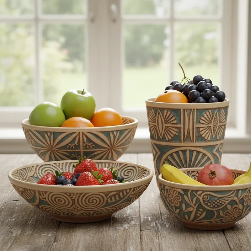 Generous fruit bowls combine function with artistry, creating kitchen centerpieces that encourage healthy eating through beautiful presentation. Throw or hand-build wide, shallow forms with slightly flared walls for easy fruit access. Carve decorative patterns around exteriors while clay remains leather-hard for crisp, clean lines. Consider botanical motifs, geometric borders, or abstract designs that complement your kitchen aesthetic. The bowl's curve must be gradual enough to support rounded fruits without rolling. Size matters; make bowls large enough for family needs but manageable for table placement. Food-safe glazes in colors that enhance rather than compete with colorful produce work best. Your carved details catch light and shadow, adding visual interest even when the bowl sits empty. Handmade fruit bowls elevate ordinary countertop storage into decorative displays that make produce irresistible.