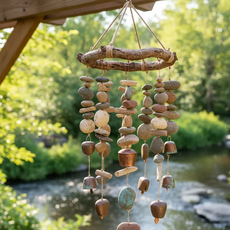 Construct unique wind chimes using river rocks that create gentle, earthy sounds different from traditional metal or wood. These natural instruments bring subtle music to gardens and porches while adding visual interest through movement. Drill holes through flatter stones or wire-wrap for hanging, combining different sizes for varied tones. You're composing with stone, creating instruments that play nature's own quiet symphony in passing breezes. The softer sounds suit noise-sensitive areas where traditional chimes might annoy neighbors or disturb peace. Paint rocks in gradient colors for rainbow effects or leave natural for organic aesthetics that blend seamlessly. Include driftwood or bamboo for mixed media chimes that combine different natural materials harmoniously. Position where gentle winds occur regularly but avoid areas with strong gusts that might cause damage.