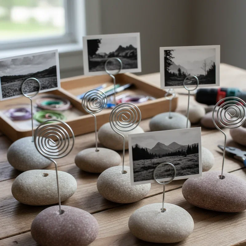 Craft unique photo displays using river rocks as bases for wire holders that showcase favorite images creatively. These natural stands turn desks, shelves, and mantels into rotating galleries that change with seasons or moods. Wrap wire around rocks, creating spirals that hold photos, postcards, or inspirational quotes securely without frames. You're displaying memories in ways that feel organic and intentional rather than cluttered or overwhelming spaces. The weight of rocks provides stability that lightweight holders lack, preventing photos from toppling constantly. Paint rocks to match room colors or leave natural for understated elegance that lets photos shine. This solution works perfectly for displaying children's artwork, rotating seasonal decorations, or showcasing travel memories. Create multiple holders for table centerpieces at events, holding menu cards or table numbers stylishly.