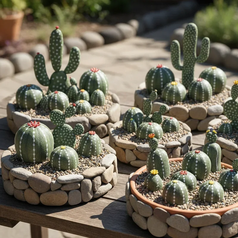Design maintenance-free desert gardens using painted river rocks shaped like various cacti species that never need watering. These whimsical creations bring southwestern charm indoors without the risk of forgotten watering or painful prickles. Paint rocks in various shades of green, adding white dots for spines and occasional bright flowers for blooming varieties. You're creating gardens that thrive on neglect, perfect for black-thumb gardeners or frequently traveling plant lovers. Arrange painted cacti rocks in terracotta pots with sand or decorative gravel for authentic desert landscape appearances. The beauty lies in creative freedom: make traditional saguaros or invent entirely new species from imagination. This craft particularly appeals to apartment dwellers lacking outdoor space or light for real succulents to survive. Add painted rock creatures like lizards or roadrunners to complete your miniature desert ecosystem scene.