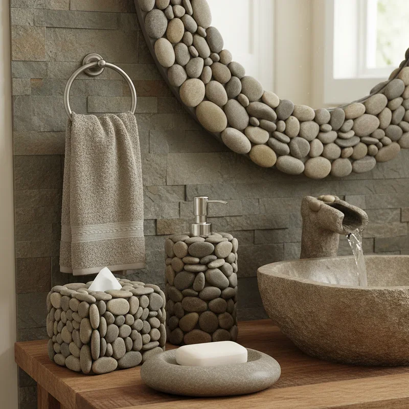 Transform ordinary bathroom items into spa-worthy accessories using river rocks for natural, water-resistant decoration that thrives in humidity. These projects bring outdoor serenity to private spaces where relaxation should reign but often feels clinical. Cover soap dispensers, tissue boxes, or trash cans with river rock facades that resist moisture naturally. You're creating resort bathroom vibes without renovation costs, using materials that actually improve with water exposure. Hot glue small rocks to existing accessories or create entirely new pieces from scratch using waterproof adhesives. The natural variations in stone colors complement any bathroom palette while adding textural interest to smooth surfaces. Include river rock soap dishes that drain naturally or toothbrush holders that bring organic elements to countertops. These accessories clean easily with normal bathroom maintenance, aging gracefully rather than showing wear quickly.