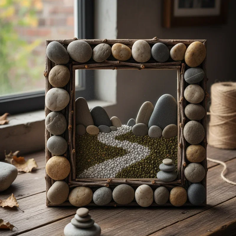 Build unique picture frames using river rocks to create rustic borders that bring natural texture to your favorite memories. These three-dimensional frames turn ordinary photos into gallery-worthy displays that catch eyes and start conversations instantly. Select rocks of similar thickness but varying sizes for organic patterns that flow around rectangular photo openings naturally. You're framing memories with pieces of Earth itself, creating connections between captured moments and timeless natural elements. Hot glue works best for securing stones to wooden or cardboard backing, building up layers for depth. The frames suit beach photos, nature shots, or any image that benefits from organic embellishment perfectly. This technique works for mirrors too, transforming basic reflective surfaces into statement pieces worthy of featured wall placement. Vary stone colors for different moods: white for clean modern looks, mixed for eclectic charm.
