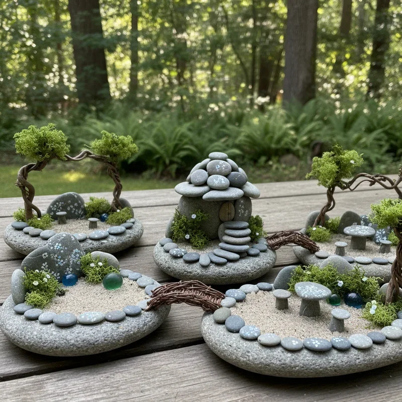 Create charming plant identification markers that blend seamlessly into your garden while serving practical purposes year-round. These natural labels withstand weather better than paper or plastic alternatives while adding decorative elements to vegetable patches and herb gardens. Paint or use permanent markers to write plant names, adding small illustrations for visual appeal and easy identification. You're making functional art that helps you remember what you planted where, especially useful for perennial gardens. Choose flatter stones that stand upright easily or lean against plants without toppling in wind or rain. The weathered look that develops over seasons adds character rather than detracting from appearance like fading plastic would. This project particularly suits children learning about gardening, making plant care more engaging and personal. Include planting dates or care instructions on larger stones for complete garden documentation that's both beautiful and useful.