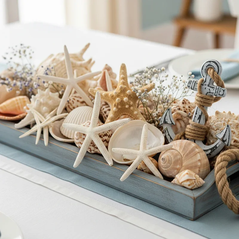 Design show-stopping centerpieces that anchor dining tables with coastal elegance perfect for everyday meals or special occasions! Fill clear glass bowls or hurricane vases with layered shells, creating height and visual interest through careful composition. Incorporate candles, air plants, or fresh flowers among shells for living centerpieces that evolve with seasons. Use wooden trays or mirrors as bases to define centerpiece boundaries and protect table surfaces. Mix shell colors and textures strategically, balancing smooth and rough, light and dark for dynamic arrangements. Consider theme variations like all-white schemes for elegant simplicity or rainbow arrays celebrating shell diversity. These centerpieces work equally well on coffee tables, console tables, or outdoor dining spaces where they withstand weather while maintaining beauty.