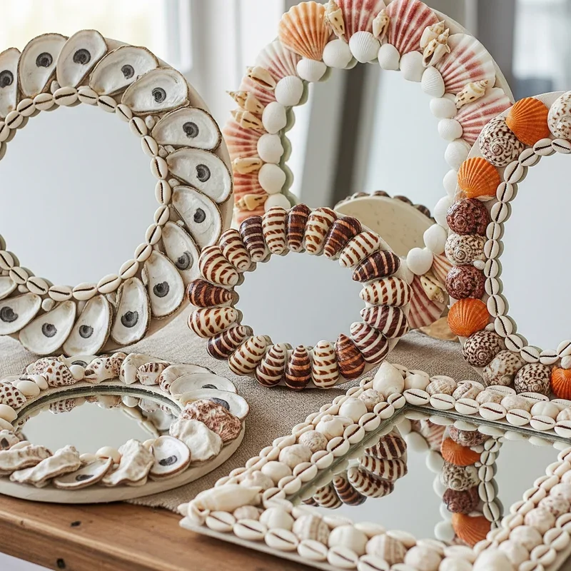 Elevate plain mirrors into stunning focal points by creating decorative shell borders that reflect both light and coastal style! Choose mirrors with wide, flat frames that provide ample surface for shell application, or add your own frame to frameless mirrors. Arrange shells in gradients from large to small, creating natural flow that draws eyes toward the mirror's center. Incorporate pearls, small pieces of coral, or sea glass between shells for added sparkle and dimension. The reflective surface multiplies the visual impact of your shell work, making rooms feel larger and brighter. Seal finished pieces with clear spray coating to protect shells and ease cleaning. These mirrors work beautifully in bathrooms, bedrooms, or entryways where they serve practical purposes while doubling as artistic statements.