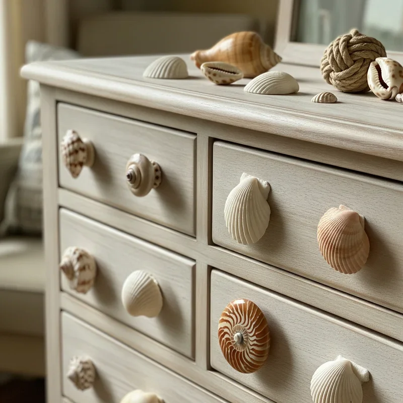 Update furniture with shell hardware that adds unexpected coastal touches to dressers, cabinets, and drawers throughout your home! Drill holes through sturdy shells and attach with appropriate screws for functional pulls that withstand daily use. Alternatively, glue shells onto existing knobs for quick updates that don't require drilling. Select shells with comfortable gripping surfaces, avoiding sharp edges that might cause discomfort. This subtle approach to coastal décor works especially well in bathrooms and bedrooms where themed elements feel natural. Mix shell types across a single piece for eclectic charm or maintain uniformity for polished looks. Protect shells with clear sealant to prevent chipping and ease cleaning. These unique hardware pieces become jewelry for furniture, adding personality to otherwise plain pieces.