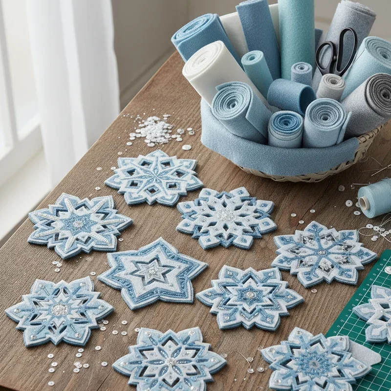 Combine function with beauty by creating felt snowflake coasters that protect your furniture while celebrating winter. Cut snowflake shapes from thick felt using templates or freehand designs, then layer different colors for depth. Add decorative stitching with embroidery floss for extra detail and durability. These soft snowflakes work year-round since they're practical as well as pretty. Make sets in different colors to match your décor or give as thoughtful handmade gifts. Kids can help by choosing colors and learning basic sewing skills with this forgiving material. The felt absorbs condensation from cold drinks, making these actually useful rather than just decorative. Store them stacked in a pretty basket where they double as winter décor when not protecting your tables.