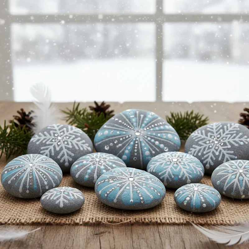 Bring the outdoors in by painting snowflake designs on smooth river rocks or stones. Use white paint pens or thin brushes to create delicate patterns on dark stones for maximum contrast. These substantial decorations work beautifully as paperweights, garden markers, or meditation stones with winter themes. Seal them with clear acrylic spray for weather-resistant outdoor decorations that survive actual snow. Kids love hunting for the perfect shaped rocks, making this a complete adventure from start to finish. Create a collection representing different snowflake types, or paint matching sets for unique holiday gifts. These painted rocks can be hidden around your community for others to find, spreading winter joy in unexpected places. The weight and permanence of stone gives these snowflakes a special significance.