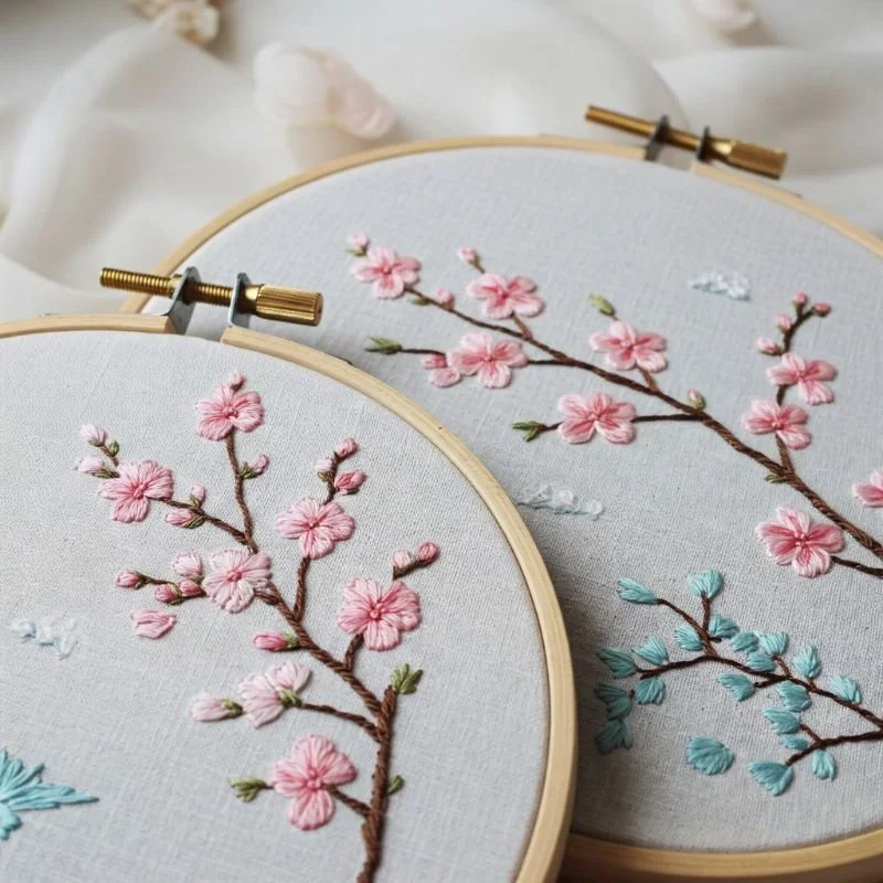 Celebrate spring's iconic flowering branches with dimensional embroidery pieces that combine traditional stitchwork with unexpected textural elements. Begin with natural linen fabric stretched in wooden embroidery hoops, then sketch simple branch forms as your foundation. Using basic embroidery stitches, create branches with brown embroidery floss, adding textural elements with French knots, seed stitches, and couched threads. The magic happens when you add three-dimensional blossoms using pale pink or white wool felt—tiny hand-cut petals gathered and stitched into miniature flowers attached along your embroidered branches. Doesn't this combination of techniques create wonderful depth? I particularly love grouping several hoops in varying sizes to create gallery walls that bring spring's orchard beauty indoors. These pieces honor slow-crafting traditions while creating contemporary botanical art that celebrates seasonal splendor without the maintenance or wilting concerns of actual cut branches.