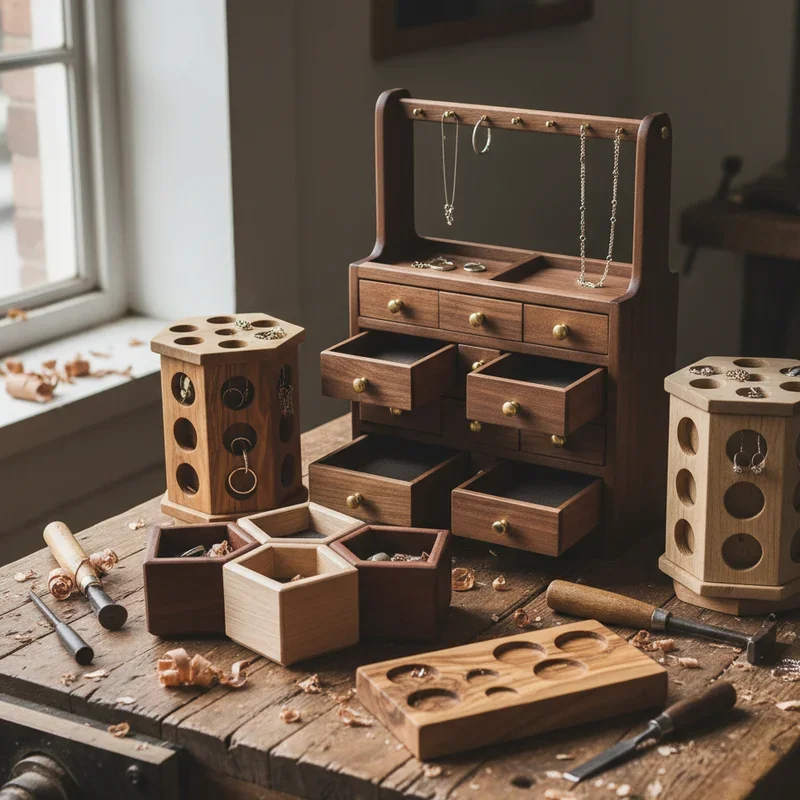 Craft jewelry storage solutions that solve the universal problem of tangled necklaces and missing earrings. Build wall-mounted organizers with hooks, slots, and compartments tailored to different jewelry types. Create luxury jewelry boxes with velvet linings and multiple levels for premium market segments. Price from $25 for simple organizers to $150+ for elaborate boxes with mirrors and locks. Target both personal use and gift markets where presentation matters as much as function. Add personalization options like monograms or custom dimensions for specific collections. Include anti-tarnish properties through specific wood choices or treatments for added value. Your jewelry organizers become treasured keepsakes that protect valuable items, proving that beautiful storage solutions command prices far exceeding their material costs.