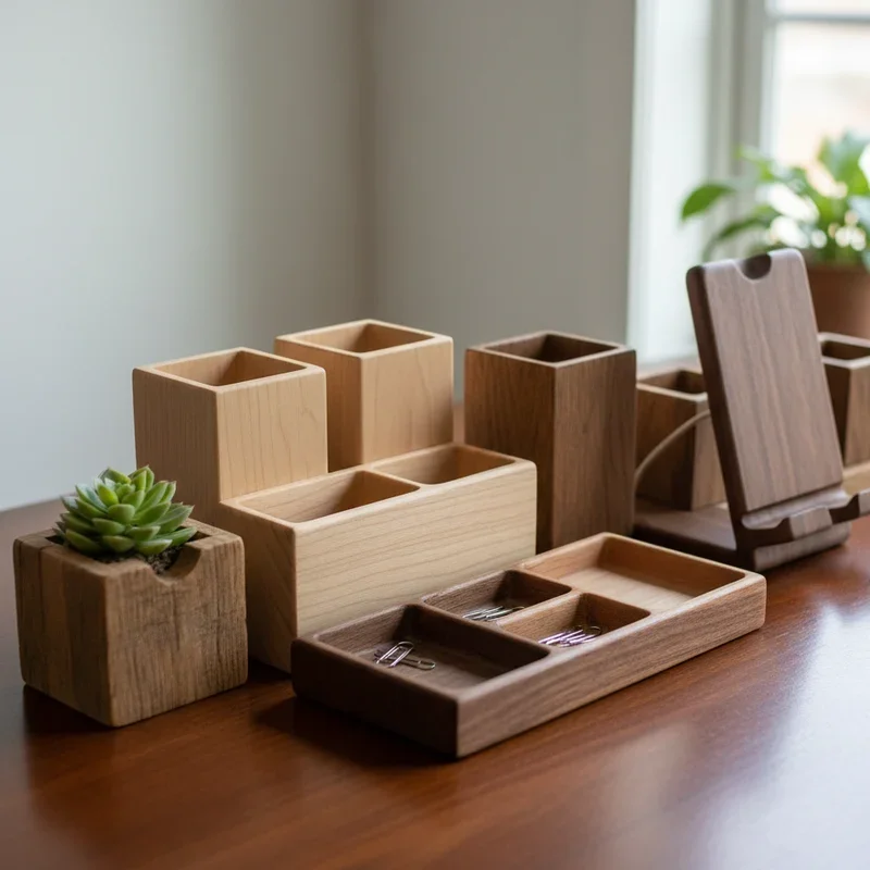 Solve workspace chaos with wooden organizers that bring order and style to home offices and desks. Design pen holders, paper trays, and phone stands that reduce clutter while adding warmth. Create modular systems that adapt to different needs and desk sizes for maximum flexibility. Price from $15 for single-function pieces to $75 for comprehensive organization systems. Target remote workers and students who spend significant time at desks needing organization. Include cable management features for modern workspace needs involving multiple devices and chargers. Offer corporate gifting options with logo engraving for business-to-business sales opportunities. Your organizers become productivity enhancers that prove organized spaces inspire better work, justifying investment in quality desk accessories.